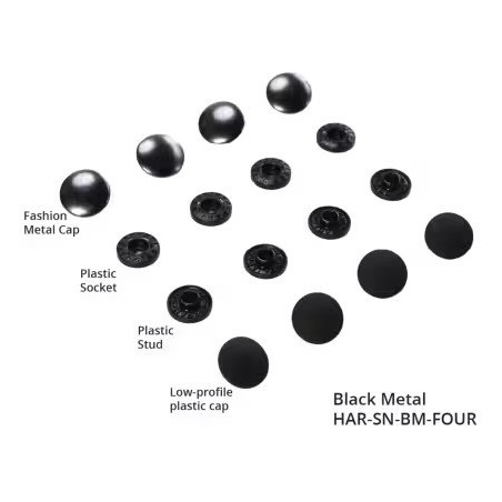 Underneath the metal finish, the Tool-free snaps components (socket, stud, and low-profile cap) are made of plastic, keeping weight and thickness to a minimum.